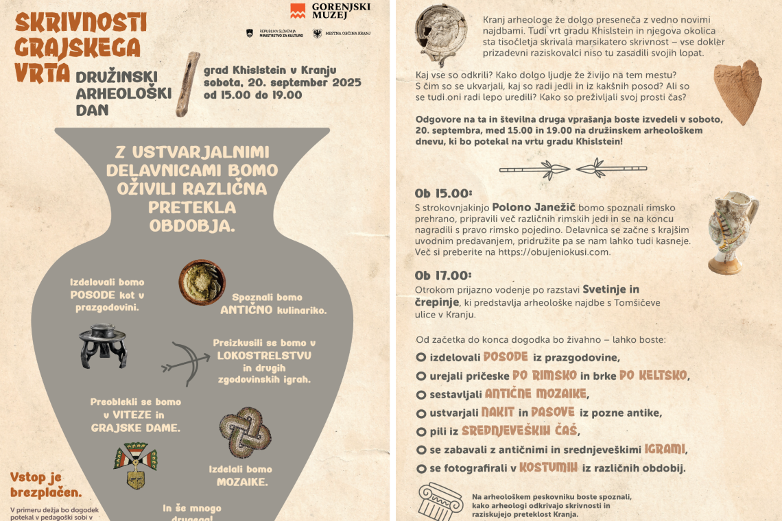 Na vrtu gradu Khislstein v Kranju bo v soboto med 15. in 19. uro potekal družinski arheološki dan, ki ga pripravlja Gorenjski muzej v sodelovanju z Mestno občino Kranj in Ministrstvom za kulturo. Dogodek pod naslovom Skrivnosti grajskega vrta bo obiskovalcem približal preteklost skozi ustvarjalne delavnice, predstavitve in otrokom prijazna vodenja.